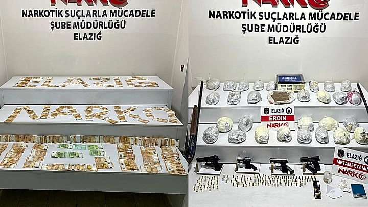 Elazığ'da polis ekiplerince düzenlenen uyuşturucu operasyonunda 30 kilo 800 gram eroinin yanı sıra çok sayıda silah ve yüklü miktarda para ele geçirildi.