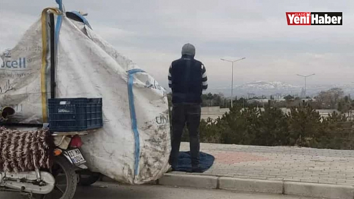 Elazığ'da ismi öğrenilemeyen kağıt toplayıcısının montunu kendisine seccade yapıp namaz kılması görenleri duygulandırdı.