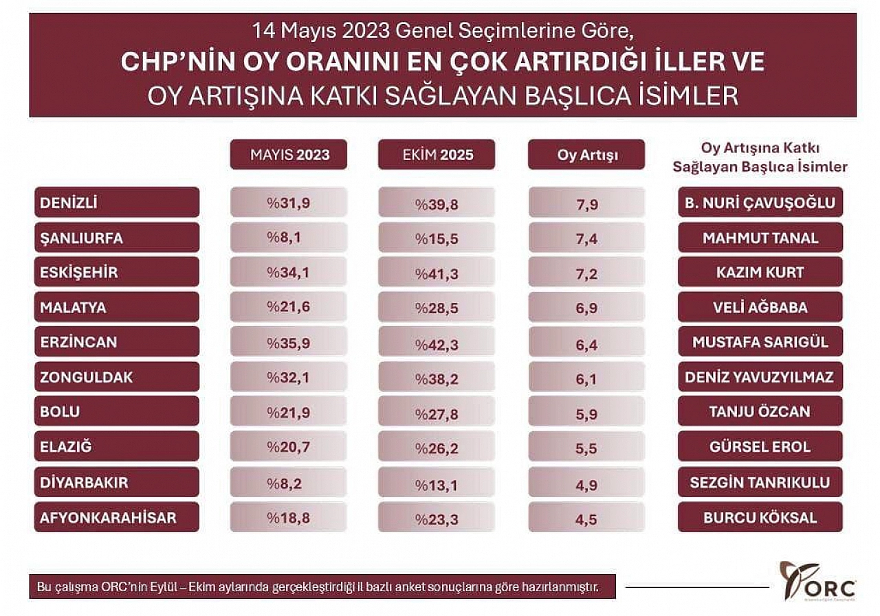 ORC Araştırma Şirketi'nin Eylül–Ekim aylarında gerçekleştirdiği İl bazlı anket sonuçlarına göre, Cumhuriyet Halk Partisi'nin oy oranını en çok artırdığı İller arasında Elazığ da yer aldı.