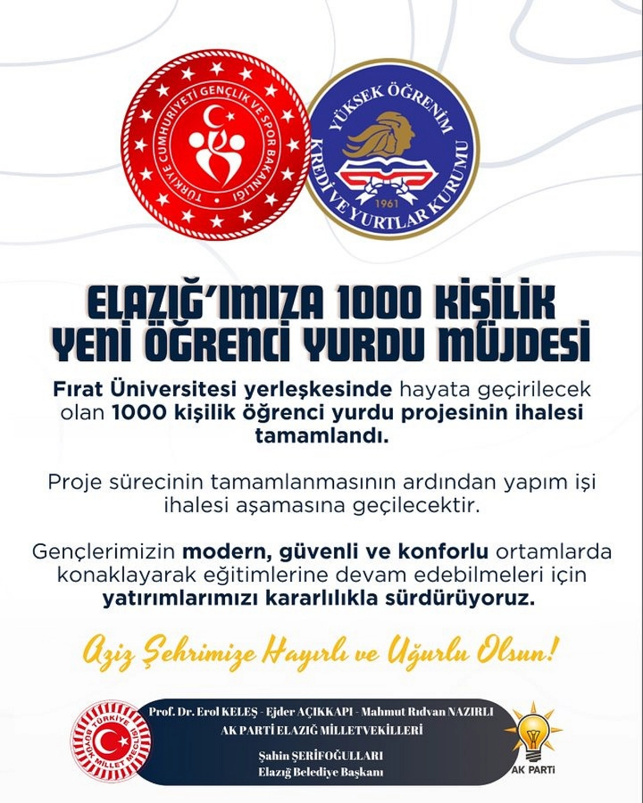 AK Parti Elazığ Milletvekilleri Prof. Dr. Erol Keleş, Ejder Açıkkapı ve Mahmut Rıdvan Nazırlı ile Elazığ Belediye Başkanı Şahin Şerifoğulları yaptıkları ortak açıklamada projenin Elazığ gençliği için büyük önem taşıdığını belirtilerek; "Gençlerimizin modern, güvenli ve konforlu ortamlarda konaklayarak eğitimlerine kesintisiz devam edebilmeleri için yatırımlarımızı kararlılıkla sürdürüyoruz. Öğrenci yurdu projesinin ihalesi tamamlanmıştır. Proje sürecinin tamamlanmasının hemen ardından yapım işi ihalesi aşamasına geçilecektir." denildi.