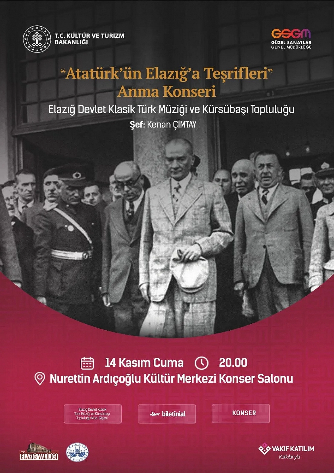 Güzel Sanatlar Genel Müdürlüğü tarafından düzenlenen konser, Mustafa Kemal Atatürk’ün Elazığ’a yaptığı ziyaretleri anmak ve onun hatırasını yaşatmak amacıyla müzikseverlerle buluşacak. Katılımcılar, klasik Türk müziğinin seçkin eserleri eşliğinde unutulmaz bir akşam yaşayacak.