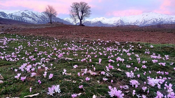 Tarlaları süsleyen çiğdem çiçekleri, çevreye adeta görsel bir şölen sundu. Yüksek kesimlerdeki kar manzarasıyla iç içe açan çiçekler, ortaya eşsiz manzaralar çıkardı.