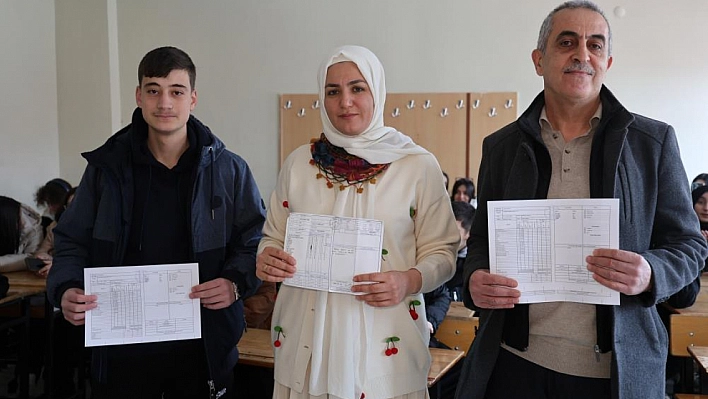 Elazığ Hıdır Sever Anadolu Lisesi'nde 20 yıl önce öğrenci olan öğretmen ile onun öğretmeni ve bugün karne alan öğrenci aynı karede buluştu.