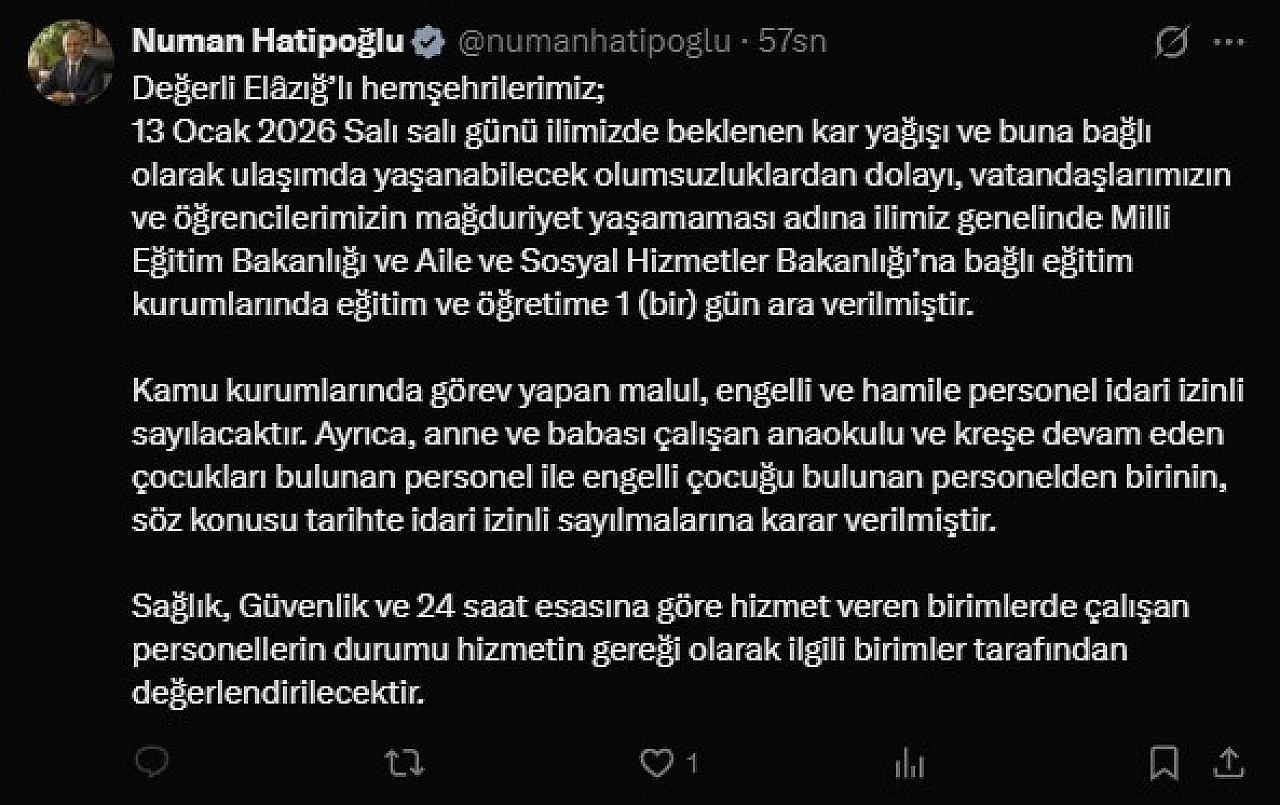 Elazığ Valiliğinden yapılan açıklamada, ilimizde devam eden yoğun kar yağışından dolayı 13 Ocak Salı günü eğitim ve öğretime 1 günlük ara verildi.