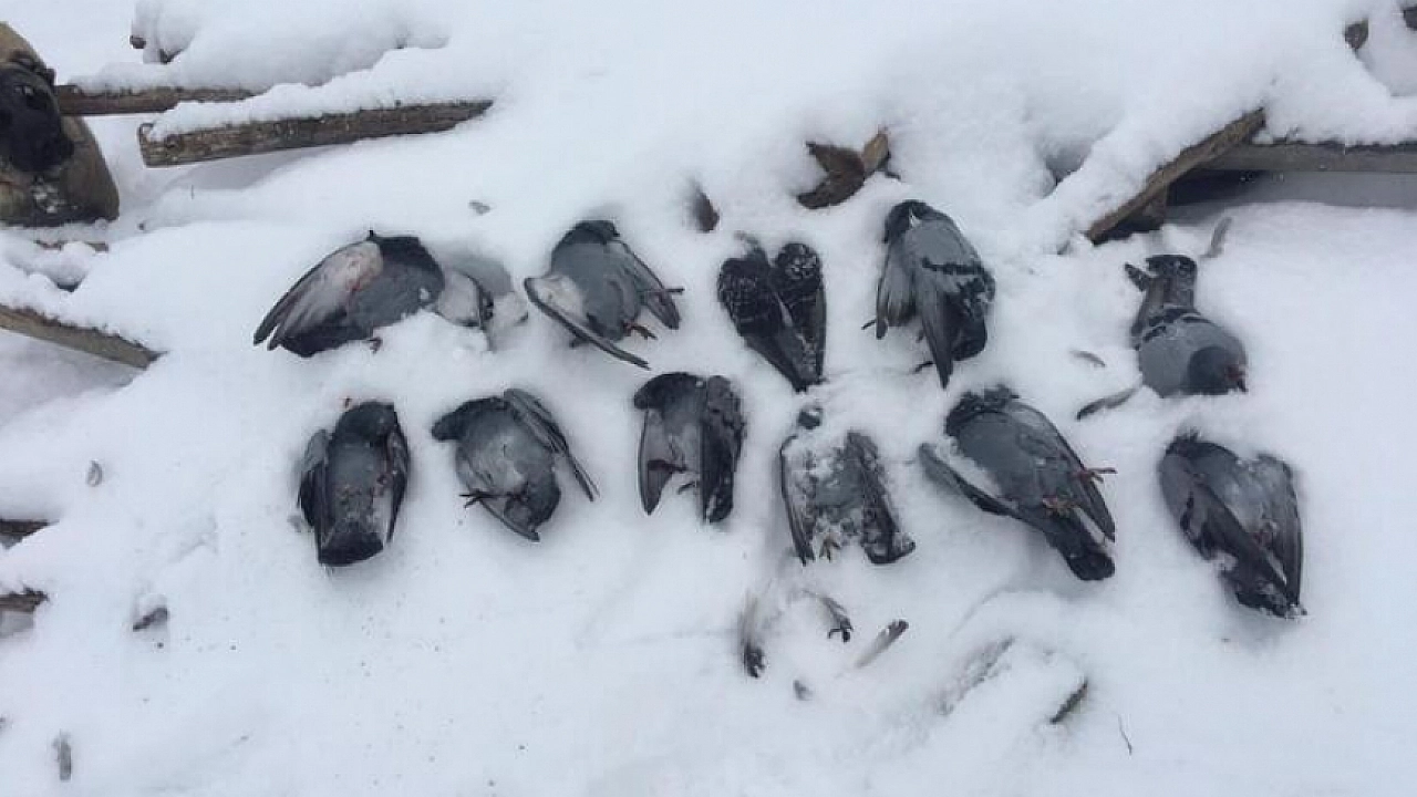 Hava sıcaklığının eksi 13 dereceleri gördüğü Elazığ'da, onlarca güvercin donarak telef oldu.