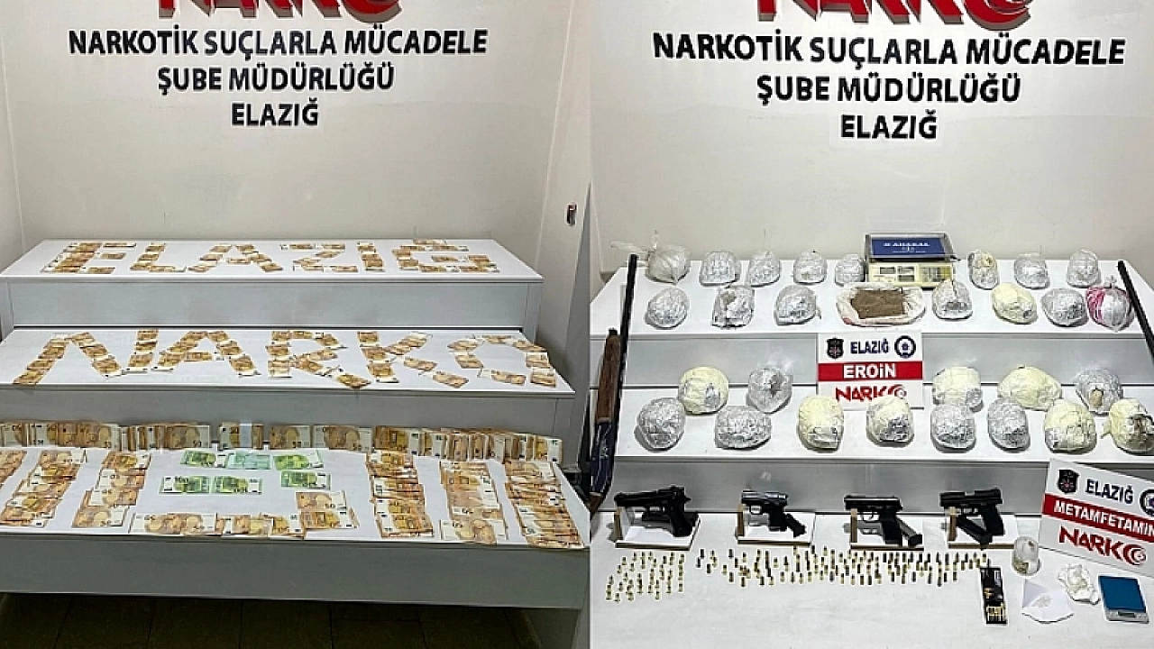 Elazığ'da polis ekiplerince düzenlenen uyuşturucu operasyonunda 30 kilo 800 gram eroinin yanı sıra çok sayıda silah ve yüklü miktarda para ele geçirildi.