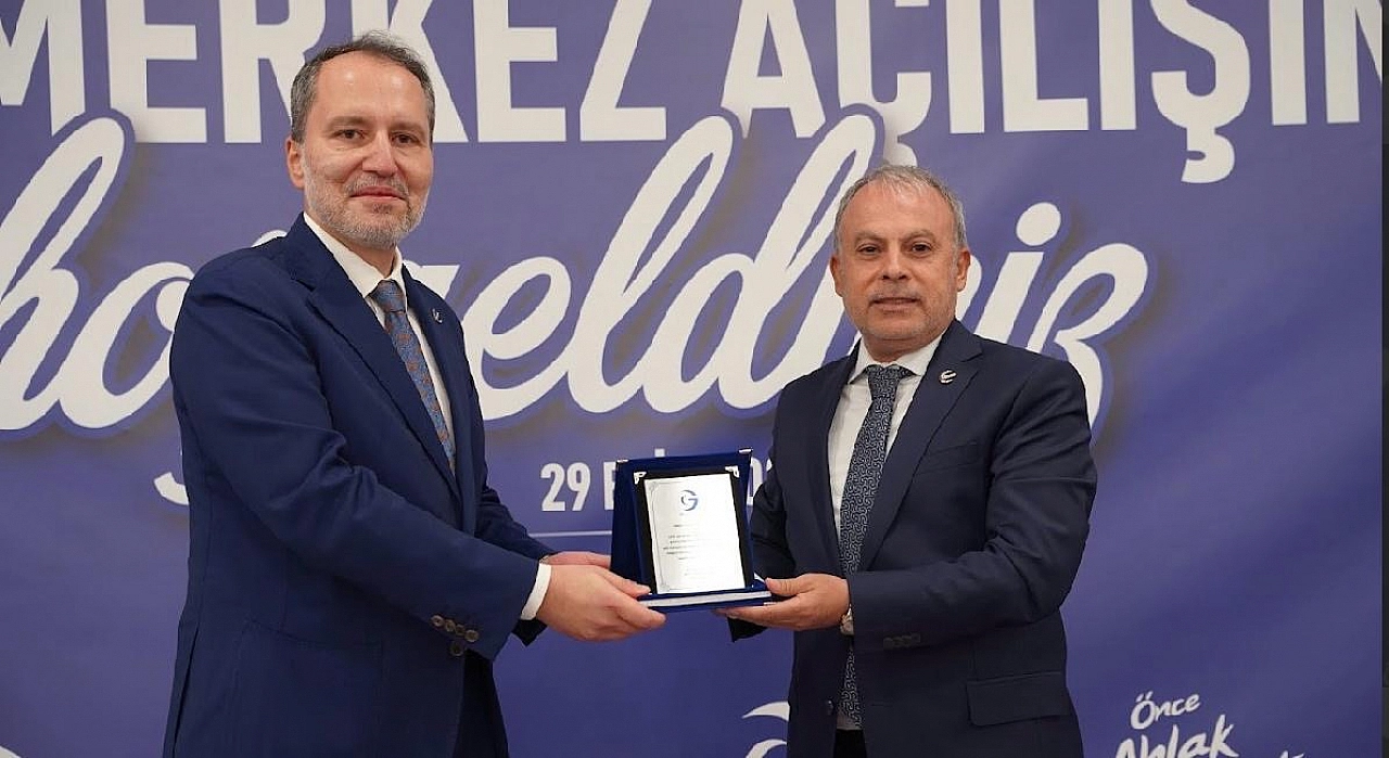 Yeniden Refah Partisi Genel Başkanı Dr. Fatih Erbakan, MKYK Üyesi Mehmet Gül'e plaket takdim etti.