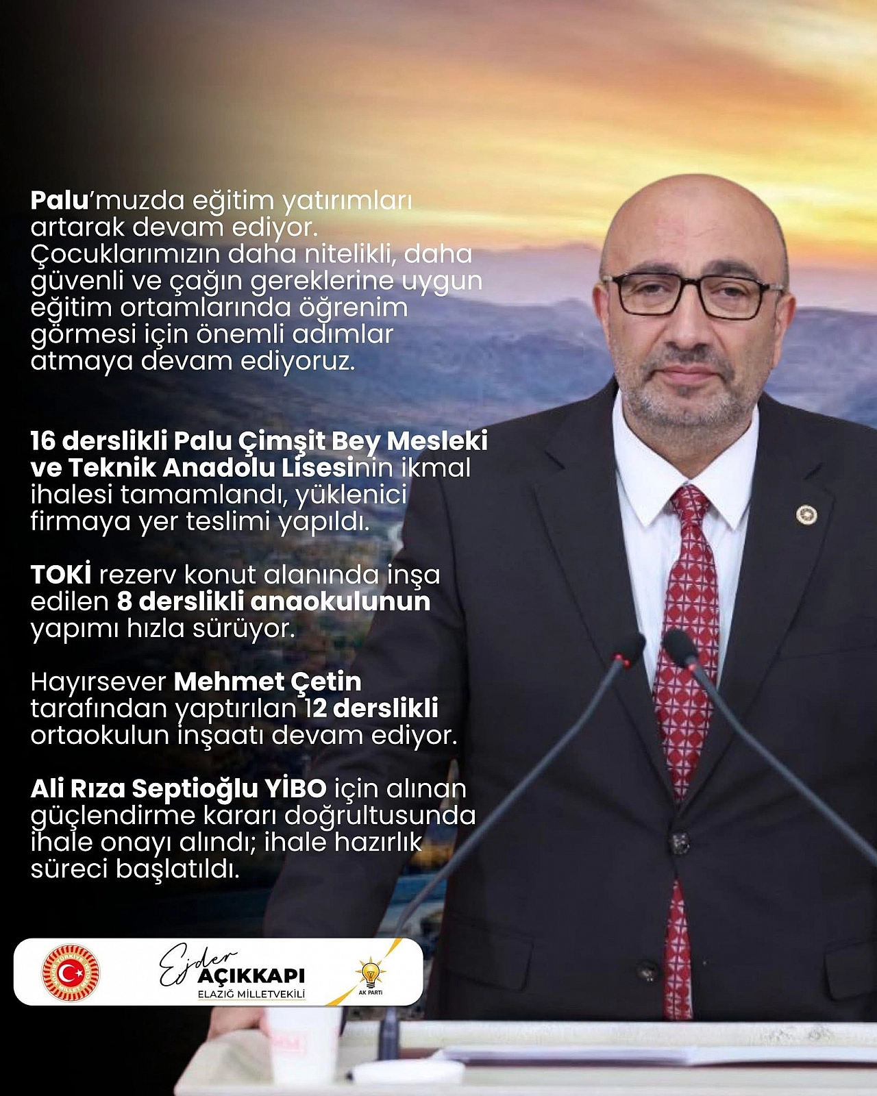 Milletvekili Açıkkapı, bu kapsamda Palu Çimşit Bey Mesleki ve Teknik Anadolu Lisesi için önemli bir aşamanın tamamlandığını belirterek, 16 derslikli okulun ikmal ihalesinin tamamlandığını ve yüklenici firmaya yer tesliminin yapıldığını ifade etti. Eğitim yatırımlarının yalnızca ortaöğretimle sınırlı olmadığını dile getiren Açıkkapı, TOKİ rezerv konut alanında inşa edilen 8 derslikli anaokulunun yapımının hızla devam ettiğini, ayrıca hayırsever Mehmet Çetin tarafından yaptırılan 12 derslikli ortaokulun inşaat çalışmalarının sürdüğünü kaydetti.