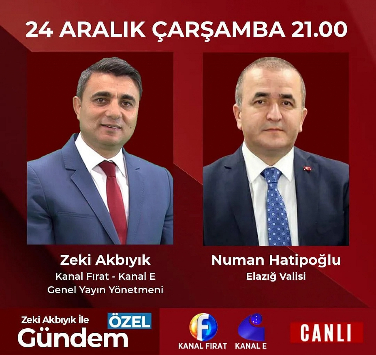 Elazığ Valisi Numan Hatipoğlu, 24 Aralık Çarşamba günü Kanal Fırat ve Kanal E Televizyonları Genel Yayın Yönetmeni Zeki Akbıyık’ın hazırlayıp sunduğu “Gündem Özel” programının konuğu olacak.