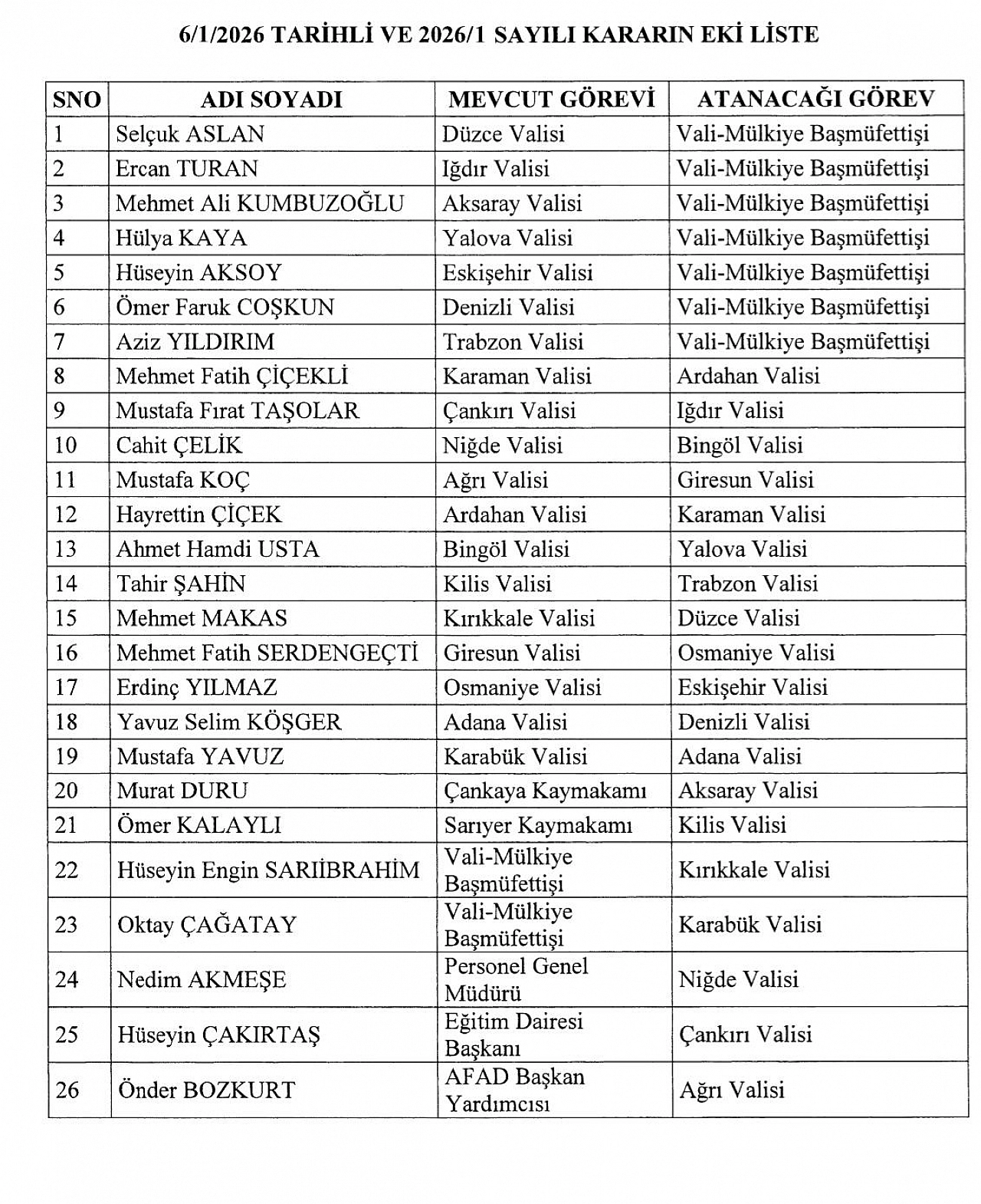 Cumhurbaşkanı Recep Tayyip Erdoğan’ın imzası ile yayımlanan karar ile birlikte, Düzce Valisi Selçuk Arslan, Iğdır Valisi Ercan Turan, Aksaray Valisi Mehmet Ali Kumbuzoğlu, Yalova Valisi Hülya Kaya, Eskişehir Valisi Hüseyin Aksoy, Denizli Valisi Ömer Faruk Çoşkun ve Trabzon Valisi Aziz Yıldırım Vali-Mülkiye Başmüfettişliği'ne getirildi.